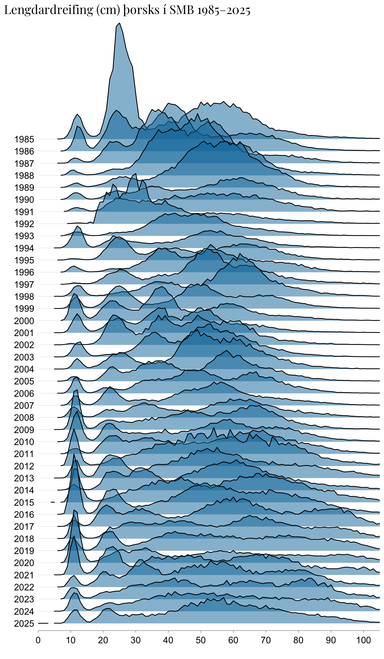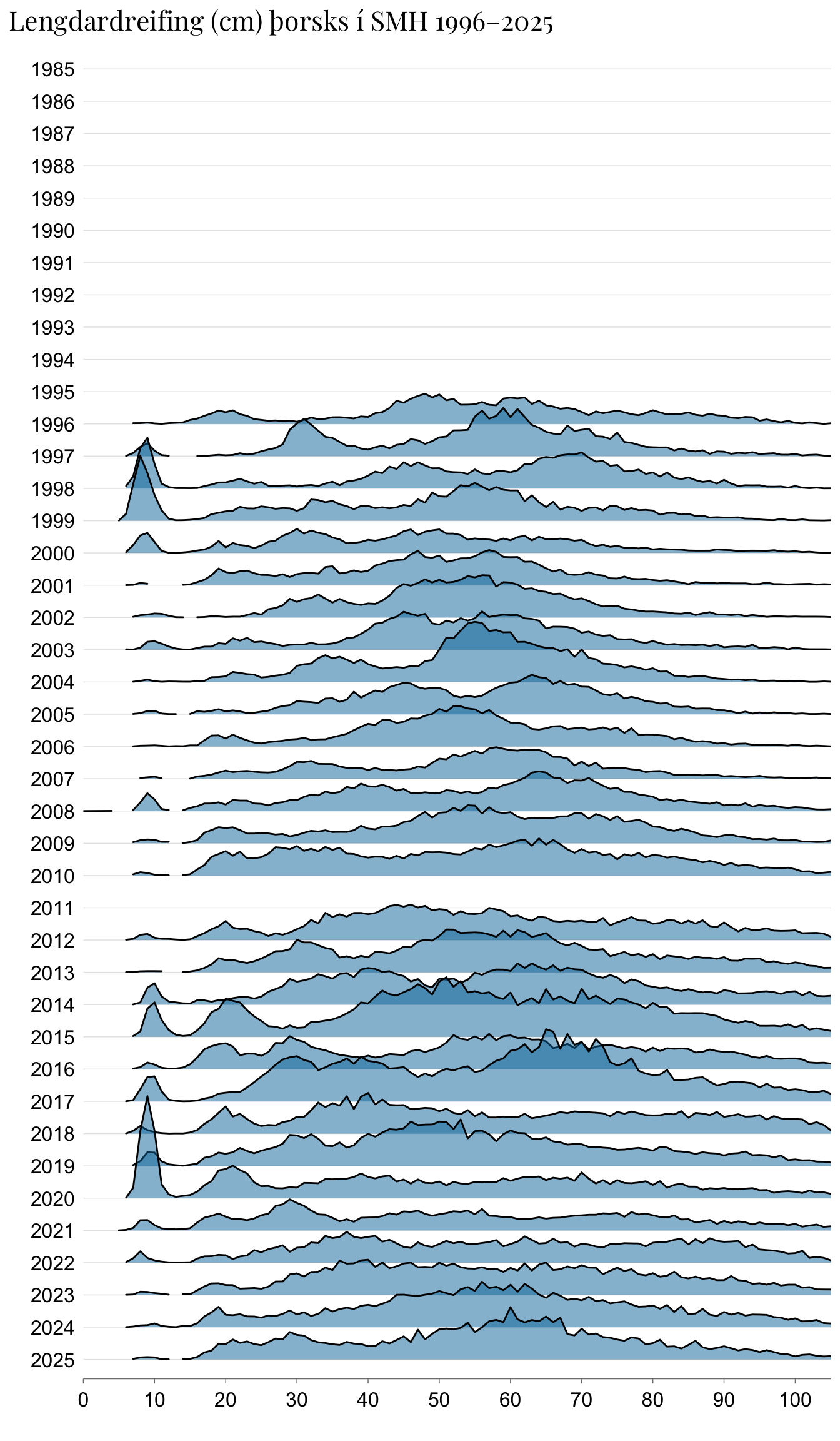 Áberandi er að fyrir árið 2007 var 1 árs þorskur í SMB með víðari lengdardreifingu og skilaðið sér betur sem 2 ára (um 25 cm) og 3 ára (um 35 cm).